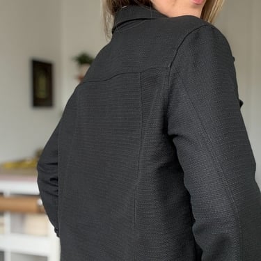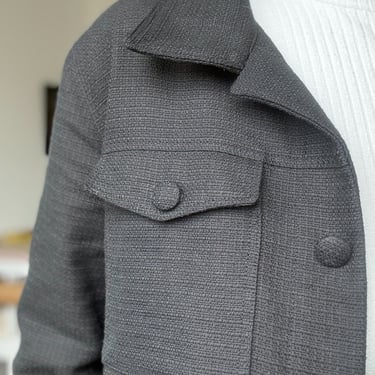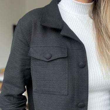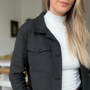 Molde digital em PDF da jaqueta Lara, modelo com bolsos frontais, recortes na frente, nas costas, na manga e vista com botão.